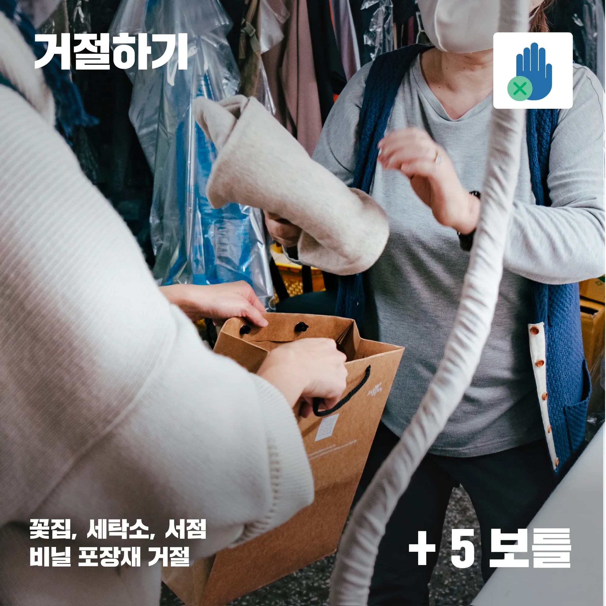 꽃집, 세탁소, 서점 등에서 비닐 포장재 거절해보아요.
