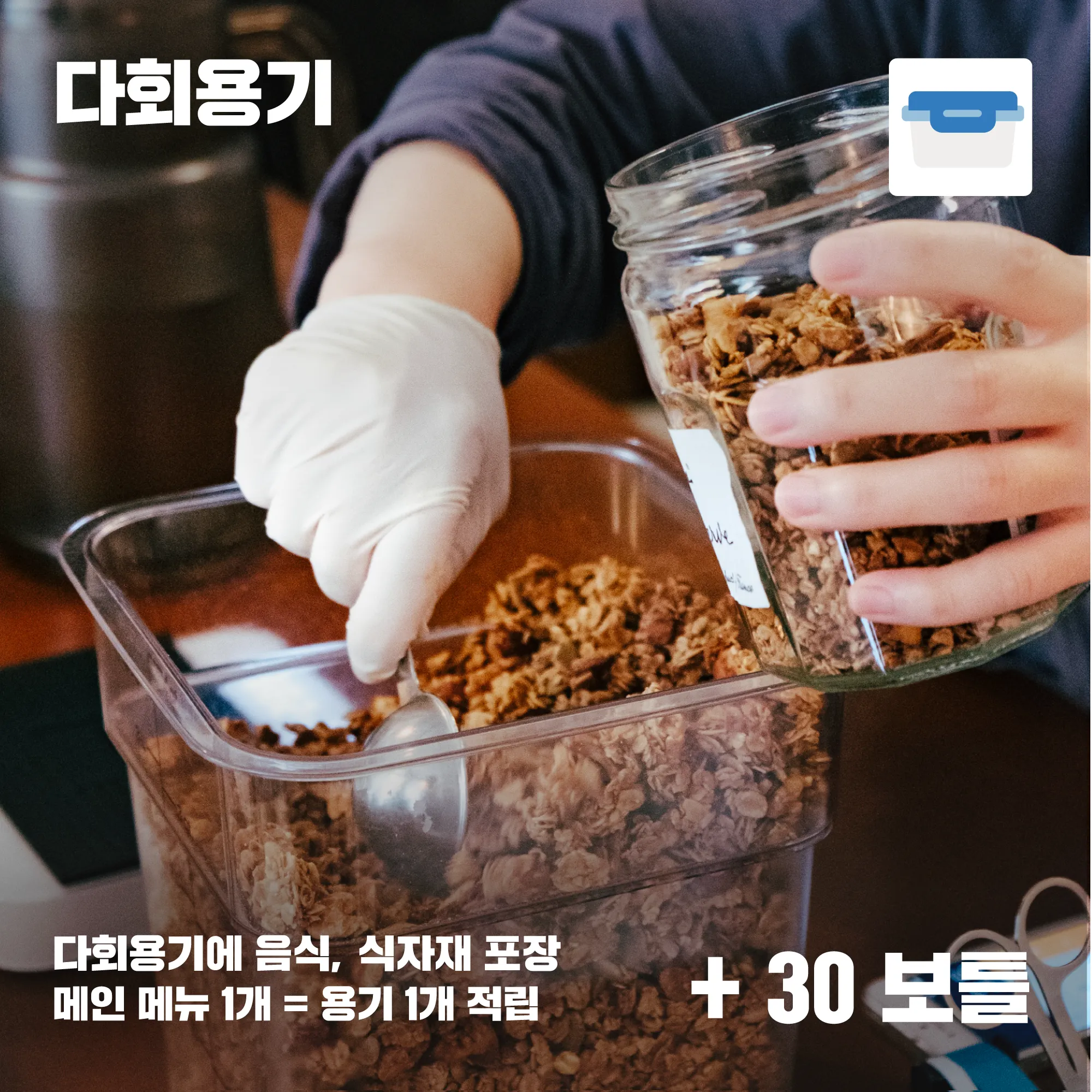 다회용기에 음식이나 식자재를 포장해보아요. ✓ 메인 메뉴 1개 = 용기 1개 적립