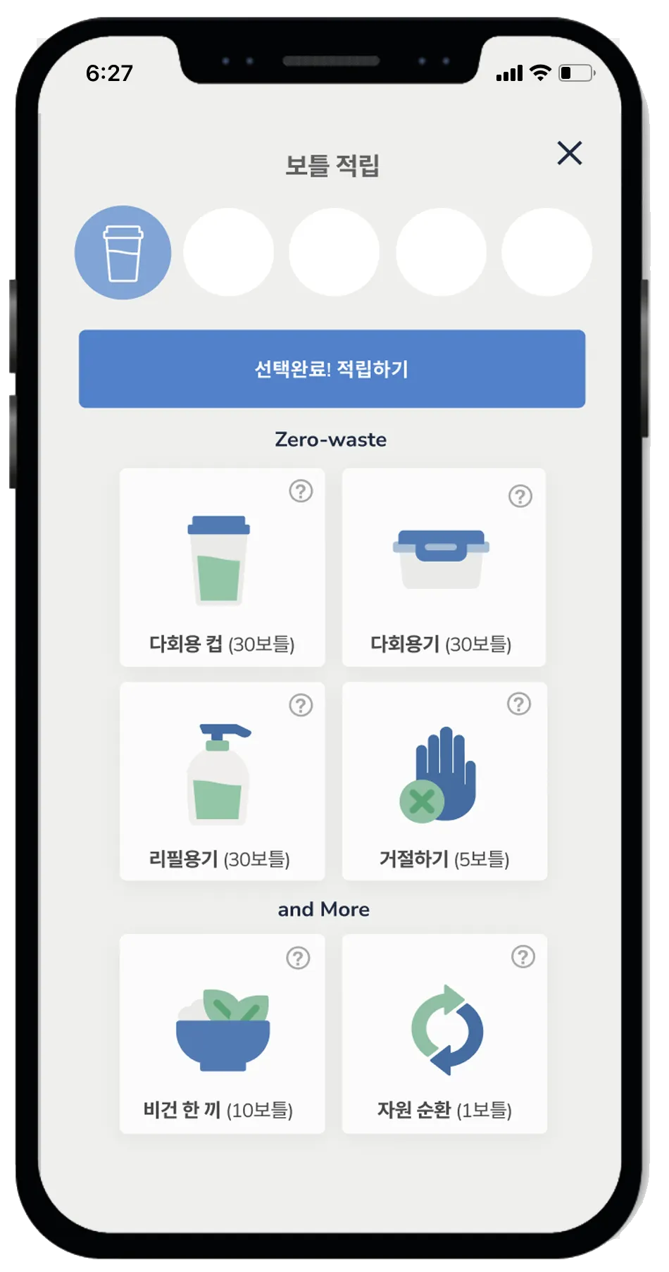 다회용 컵, 다회용기, 리필용기 등 총 6가지 실천으로 기록할 수 있어요.