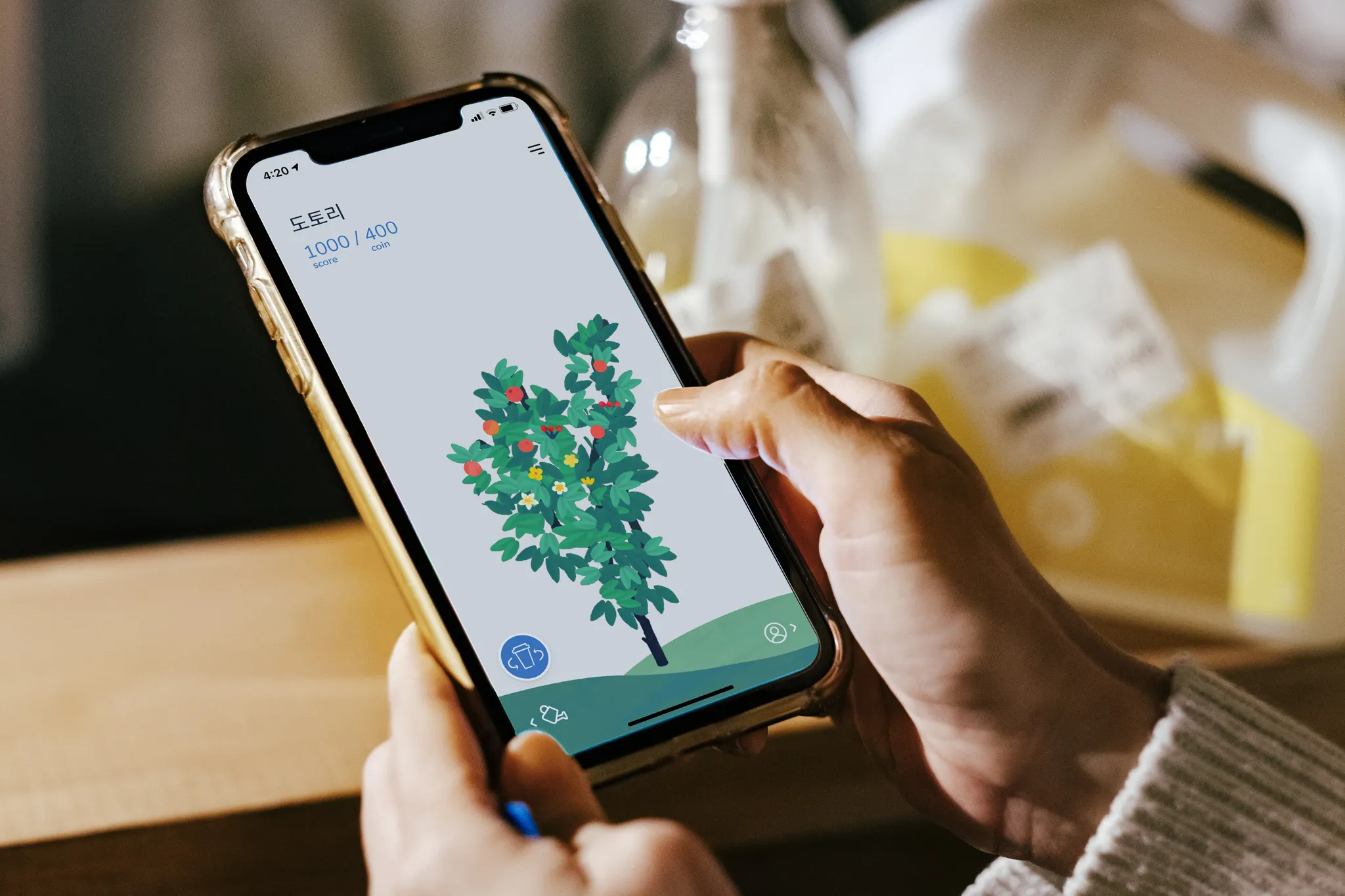제휴 가게에서 일회용품 대신 다회용기나 리필용기를 사용하거나, 비건 한 끼 실천을 기록하면 점수(보틀)이 쌓이고, 나무가 자라요.